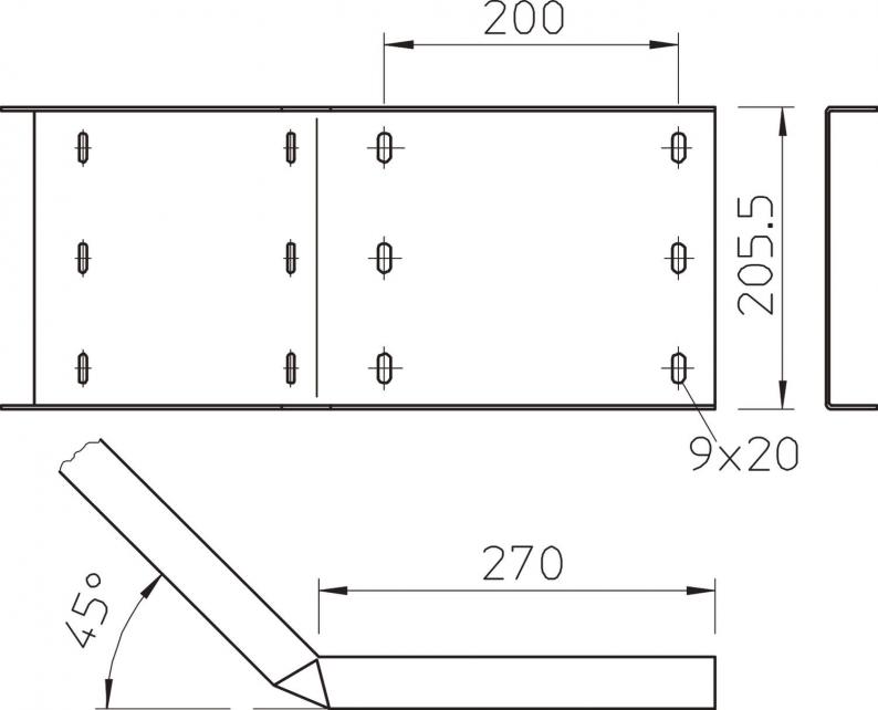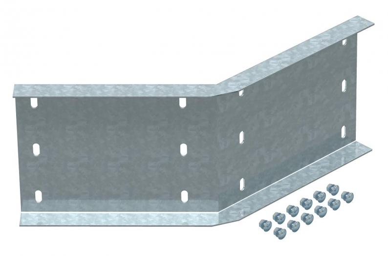 45° angle connector, horizontal, for wide span cable ladders of 200 mm side height.