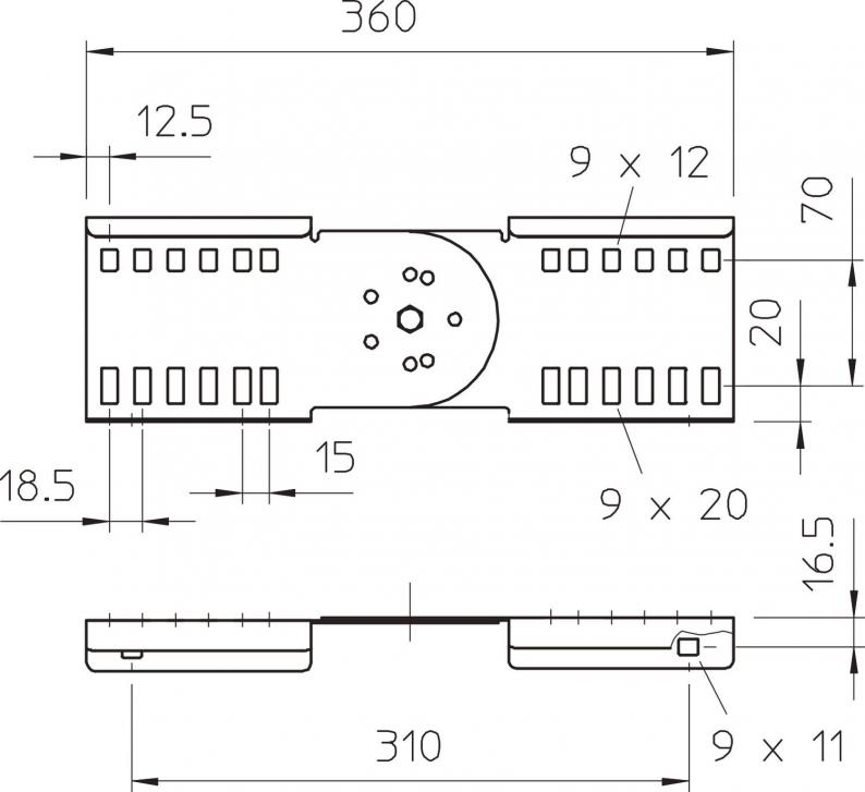 Adjustable connector as internal connector to join cable ladders and fittings with a side height of 110 mm. Angle can be adjusted vertically.