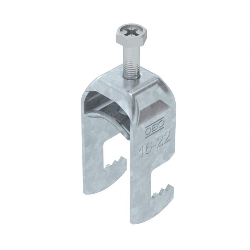 Clamp clip with F-foot, metal pressure sleeve with rounded edges to protect the cable. For vertical and horizontal mounting of 1 single cable on flat bars. With 1-start screw thread on pressure sleeve, universal hexagonal screw head WAF10, with slot and cross recess. Suitable for assembly indoors and outdoors. We recommend the use of a counter-sleeve.