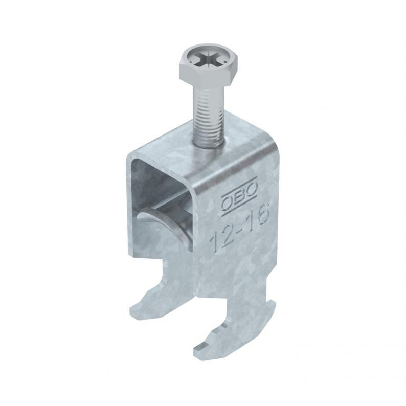 Clamp clip with hammerhead foot, metal pressure sleeve with rounded edges to protect the cable. For vertical and horizontal mounting of 1 single cable on a C-profile rail. For a slot width 16–17 mm. With 1-start screw thread on pressure sleeve, universal hexagonal screw head WAF10, with slot and cross recess. Suitable for assembly indoors and outdoors. The counter-sleeve must be ordered separately.