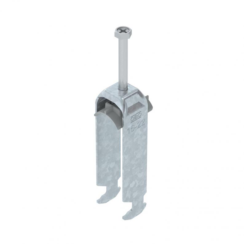 Clamp clip with hammerhead foot, plastic pressure sleeve made of polypropylene. For vertical and horizontal mounting of 3 single cables on a C-profile rail. For a slot width 16–17 mm. With 1-start screw thread on pressure sleeve, universal hexagonal screw head WAF10, with slot and cross recess. Suitable for assembly indoors and outdoors. Multiple cables should be separated by double sleeves. We recommend the use of a counter-sleeve.