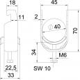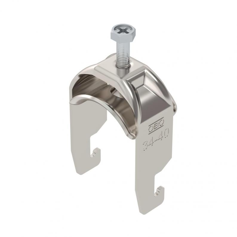 Clamp clip with U-foot, metal pressure sleeve with rounded edges to protect the cable. For vertical and horizontal mounting of 1 single cable on a C-profile rail. For slot width 18–22 mm. With 1-start screw thread on pressure sleeve, universal hexagonal screw head WAF10, with slot and cross recess. Suitable for assembly indoors and outdoors. We recommend the use of a counter-sleeve.