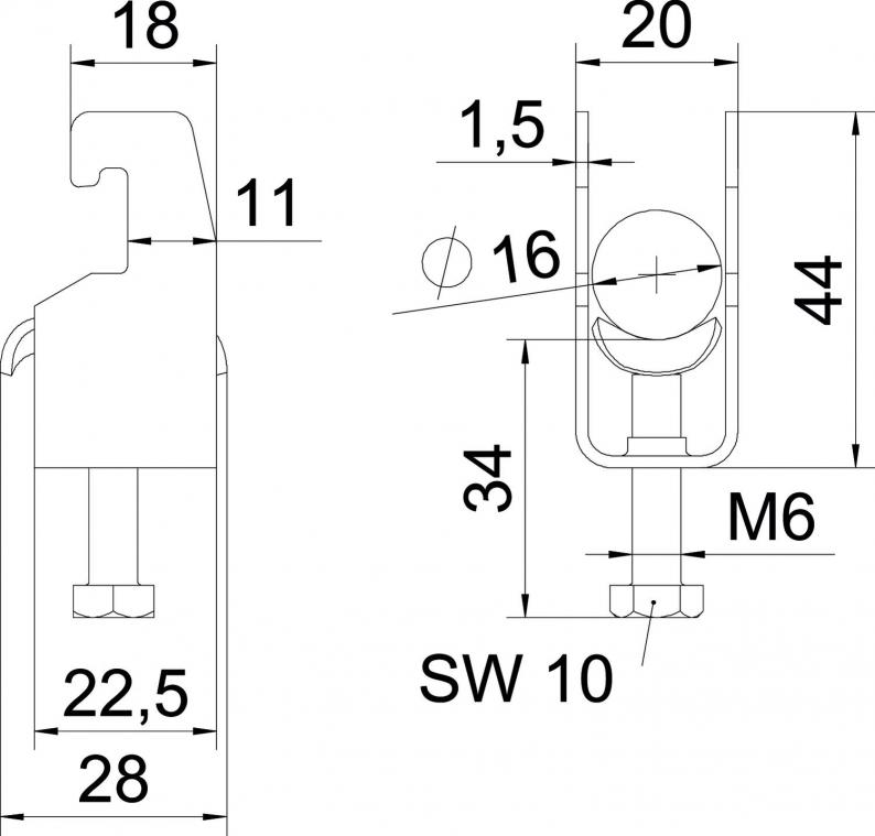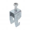 Clamp clip with U-foot, metal pressure sleeve with rounded edges to protect the cable. For vertical and horizontal mounting of 1 single cable on a C-profile rail. For slot width 18–22 mm. With 1-start screw thread on pressure sleeve, universal hexagonal screw head WAF10, with slot and cross recess. Suitable for assembly indoors and outdoors. We recommend the use of a counter-sleeve.