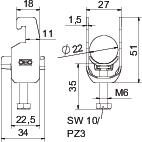 Clamp clip with U-foot, plastic pressure sleeve made of polypropylene. For vertical and horizontal mounting of 1 single cable on a C-profile rail. For slot width 18–22 mm. With 1-start screw thread on pressure sleeve, universal hexagonal screw head WAF10, with slot and cross recess. Suitable for assembly indoors and outdoors. We recommend the use of a counter-sleeve.