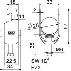 Clamp clip with U-foot, plastic pressure sleeve made of polypropylene. For vertical and horizontal mounting of 1 single cable on a C-profile rail. For slot width 18–22 mm. With 1-start screw thread on pressure sleeve, universal hexagonal screw head WAF10, with slot and cross recess. Suitable for assembly indoors and outdoors. We recommend the use of a counter-sleeve.