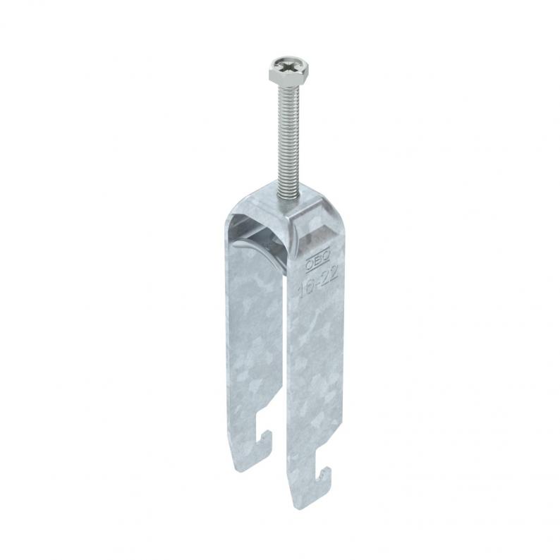 Clamp clip with U-foot, metal pressure sleeve with rounded edges to protect the cable. For vertical and horizontal mounting of 3 single cables on a C-profile rail. For slot width 18–22 mm. With 1-start screw thread on pressure sleeve, universal hexagonal screw head WAF10, with slot and cross recess. Suitable for assembly indoors and outdoors. Multiple cables should be separated by double sleeves. We recommend the use of a counter-sleeve.