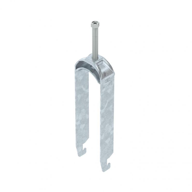 Clamp clip with U-foot, metal pressure sleeve with rounded edges to protect the cable. For vertical and horizontal mounting of 3 single cables on a C-profile rail. For slot width 18–22 mm. With 1-start screw thread on pressure sleeve, universal hexagonal screw head WAF10, with slot and cross recess. Suitable for assembly indoors and outdoors. Multiple cables should be separated by double sleeves. We recommend the use of a counter-sleeve.