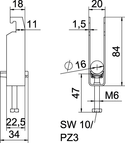Clamp clip with U-foot, plastic pressure sleeve made of polypropylene. For vertical and horizontal mounting of 3 single cables on a C-profile rail. For slot width 18 mm or 22 mm. With 1-start screw thread on pressure sleeve, universal hexagonal screw head WAF10, with slot and cross recess. Suitable for assembly indoors and outdoors. Multiple cables should be separated by double sleeves. We recommend the use of a counter-sleeve.
