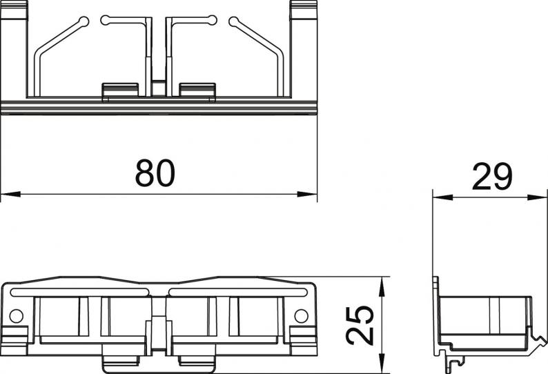 Cover adapter for mounting on trunking bases and fittings of the GAD and Rapid IBIS design device installation trunking series. The cover adapter can be pushed into a guide on the base and is used to accept the trunking cover and keep it at the desired spacing. It is also used for bundled cable exits and can be moved into the lengthwise direction. A maximum spacing of 500 mm between the cover adapters must be maintained.