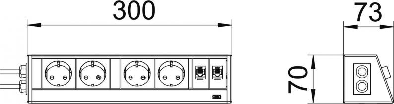 - Two black protection contact sockets in 0° connection direction, incl. 3.0 m power cable with angular connector CEE 7/7, cable exit on the left housing cover.
