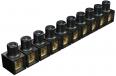 Terminals made of brass, screws of steel, galvanised and transparently passivated, 10-pole, strip separable into individual terminals, open on both sides.