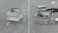 Square floor socket for use in dry-cleaned system and screed floors in indoor areas. Installation housing with pre-marked insertion openings for pipes (M20/M25). Cover adjustable to the upper edge of the floor covering with 4 height-adjustment supports. The minimum installation depth is 75 mm, the height-adjustment range is +30 mm. Frame and stainless steel cover visible in the floor covering. Cover with floor covering recess and brush outlet for routing cables. Empty housing for one Modul 45® installation device and one data socket. The data technology support for the data socket is to be ordered separately. The space is closed with a blind plate when delivered.