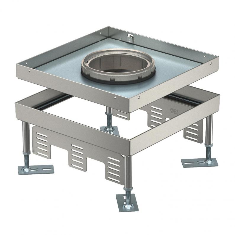 Height-adjustable cassette for tube bodies of nominal size 9 for the installation of devices in duct systems, raised and cavity floors in interior dry or wet-care floors.