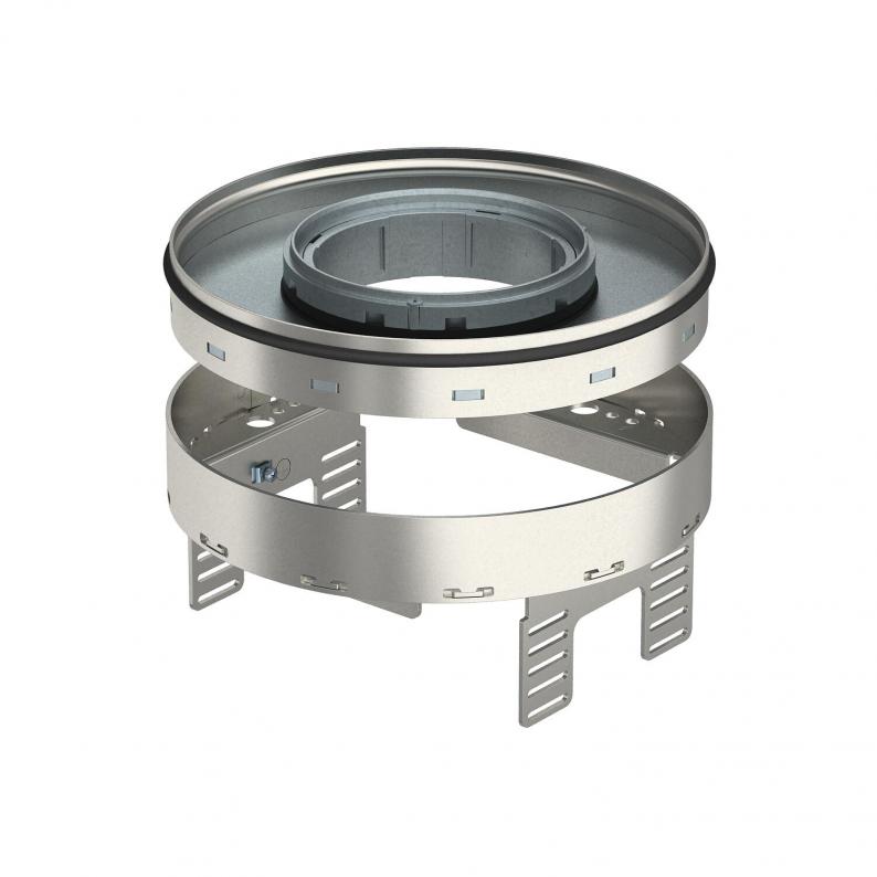 Height-adjustable cassette, decoupled from the floor, of nominal size R4, for tube bodies, for the installation of accessories in dry or wet-cleaned floors for indoor use, for mounting in underfloor boxes UZD250-3 or UZD350-3, either in conjunction with a mounting lid DUG..R4 or in UGD250-3R4 or UGD350-3R4. Mounting takes place using height adjustment brackets (order separately) in the aluminium frame profile of the underfloor boxes.