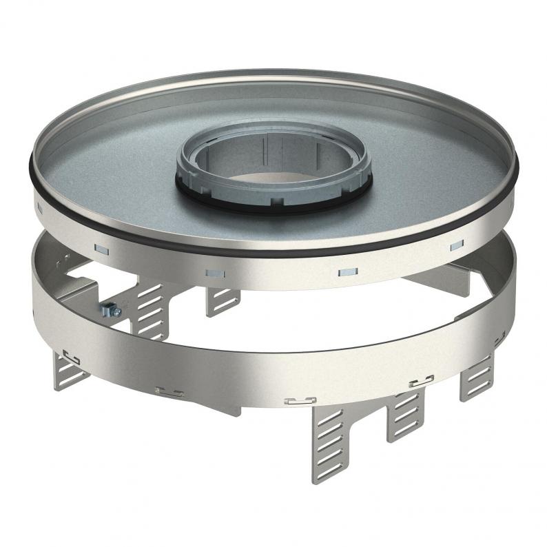 Height-adjustable cassette, decoupled from the floor, of nominal size R9, for tube bodies, for the installation of accessories in dry or wet-cleaned floors for indoor use, for mounting in underfloor boxes UZD350-3, either in conjunction with a mounting lid DUG350-3R9 or UGD350-3R9. Mounting takes place using height adjustment brackets (order separately) in the aluminium frame profile of the underfloor boxes.