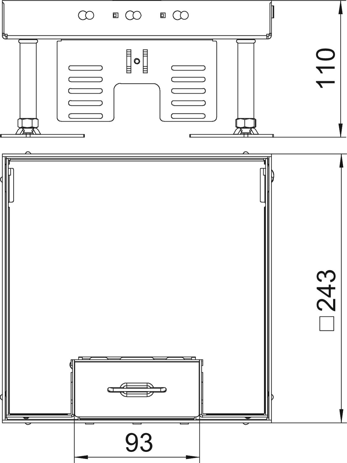 Height-adjustable square cassette, 3-compartment, with cord outlet of nominal size 9 for the installation of accessories. Suitable for the use in trunking systems, raised and cavity floors in dry- and wet-cleaned floors in indoor areas. Three cover plates APMT5 can be installed. Suitable only for smooth floor coverings.
