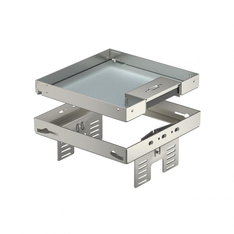 Height-adjustable cassette, decoupled from the floor, of nominal size 4, with cord outlet, for the installation of accessories in dry-cleaned floors indoors, for mounting in underfloor boxes UZD250 or UZD350, either in conjunction with a mounting cover DUG../4 or in UGD250-3/4 or UGD350-3/4. Mounting takes place using height-adjustment brackets (order separately) in the aluminium frame profile of the underfloor boxes.