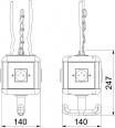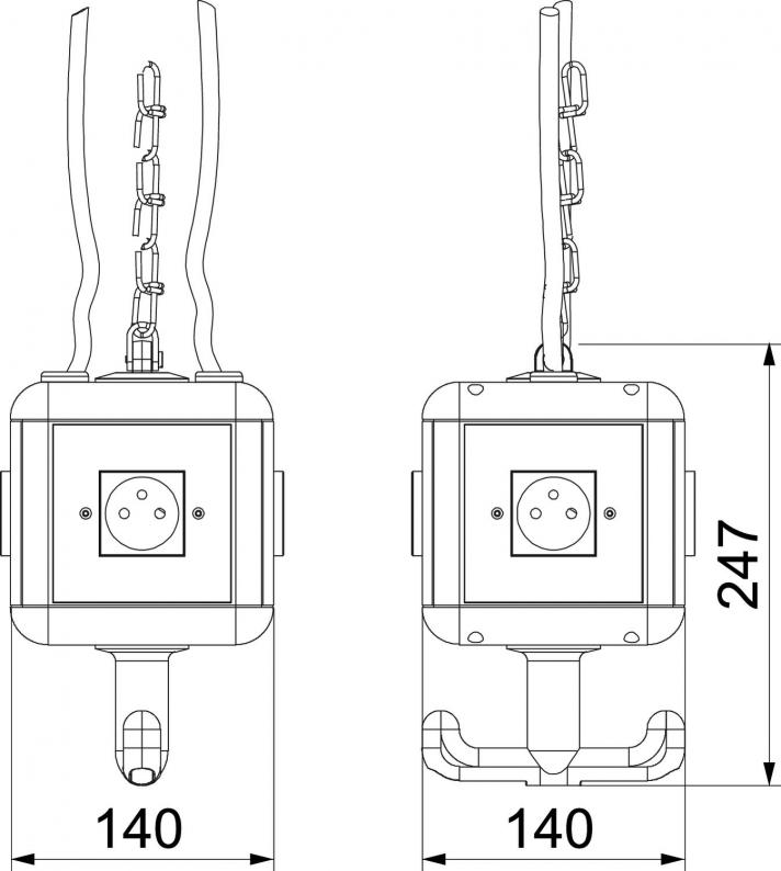 Equipped as follows: 4x single sockets with earthing pin 16 A/250 V with increased touch protection, pre-wired for two AC currents, connection via 2x 3-pin terminals, 1x CEE socket