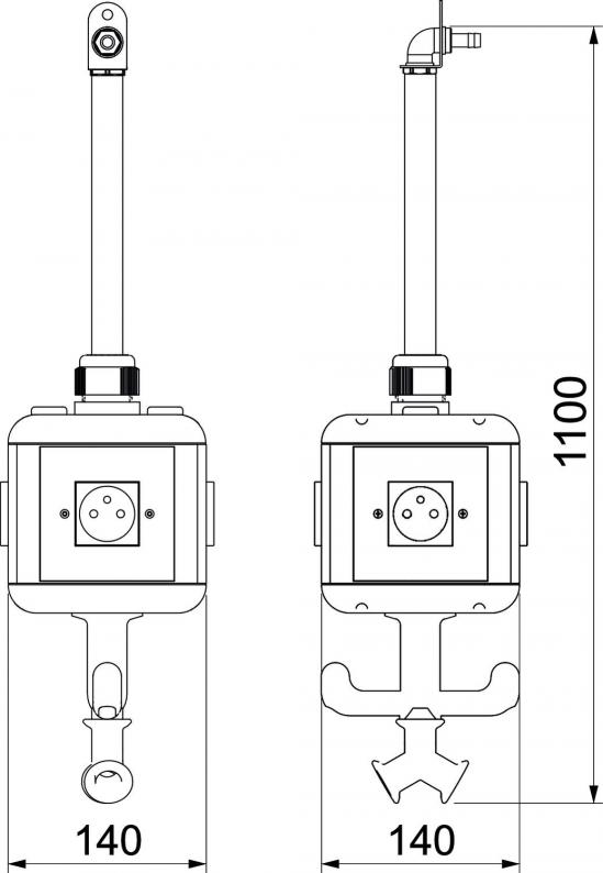 Housing equipped and pre-wired, with 1 m pipe 1/2" and connection for compressed air hose 13 x 3.5 mm and 2-way distributor 1/2", with suspension lug, grip hook and four cover plates.