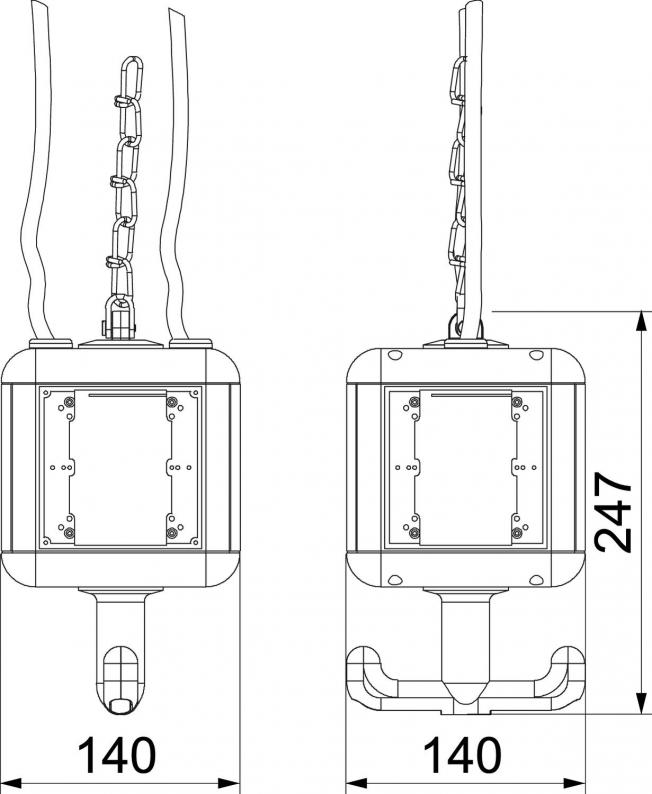 Empty housing with suspension lug and grip hook, for the installation of four electrical resources, with included partition. Without cover plates.
