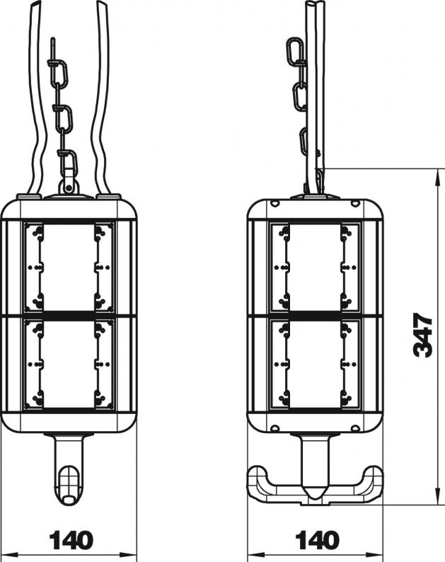 Empty housing with suspension lug and grip hook, for the installation of eight electrical resources, with included partition. Without cover plates.