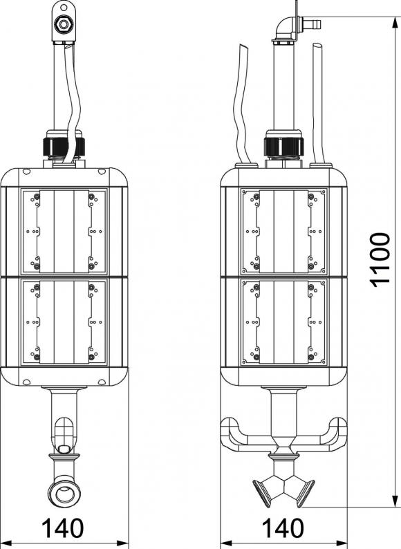 Empty housing with 1 m pipe 1/2" and connection for compressed air hose 13 x 3.5 mm and 2-way distributor 1/2". With suspension lug and grip hook, for the installation of electrical resources, with included partition. Without cover plates.