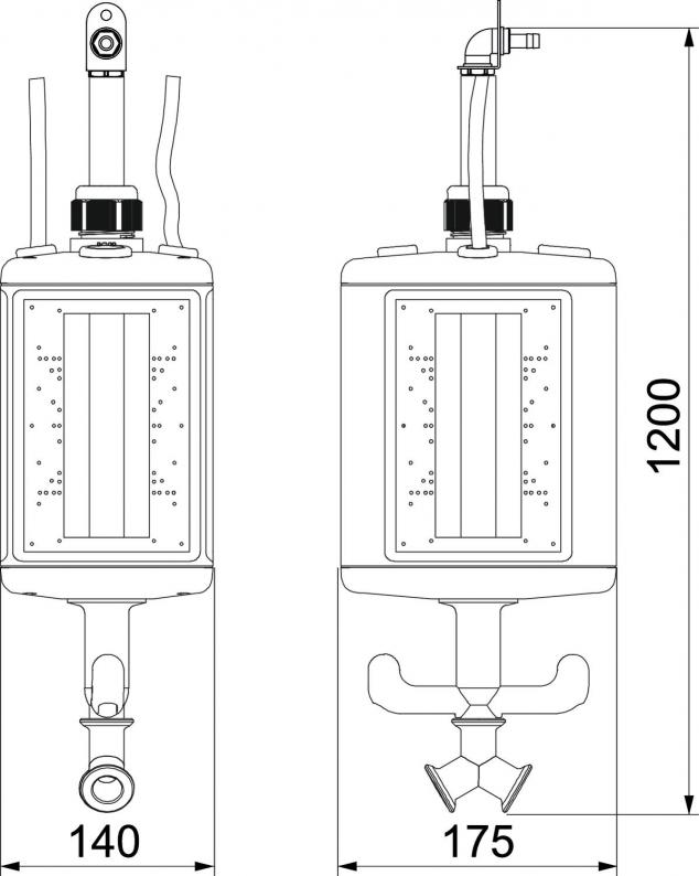 Empty housing with 1 m pipe 1/2" and connection for compressed air hose 13 x 3.5 mm and 2-way distributor 1/2". With suspension lug and grip hook, for the installation of electrical resources, with included partition. Without cover plates to supply workplaces in wet areas. Protection rating: IP44.