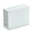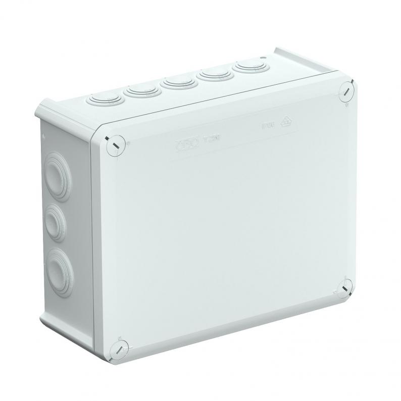 Junction box for the connection of cables and lines indoors and in protected outdoor areas. Rectangular design with plug-in seals to the sides and knock-out entries in the bottom. Suitable for wall and ceiling mounting, on mounting panels and threads in the floor. With the option to fasten inside and to mount via the corner domes. Cover with quick lock, sealable. Made from halogen-free and UV-resistant materials. Junction box according to DIN EN 60670. Flame-resistant to DIN EN 60695/2/11, test temperature 650 °C. Impact resistance IK05 according to DIN EN 50102.