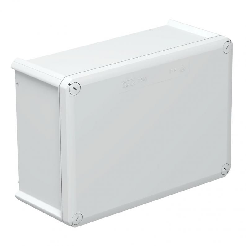 Closed junction box for the connection of cables and lines indoors and in protected outdoor areas. Rectangular design without entries. Suitable for wall and ceiling mounting, on mounting panels and threads in the floor. With the option to fasten inside and to mount via the corner domes. Cover with quick lock, sealable. Made from halogen-free and UV-resistant materials.