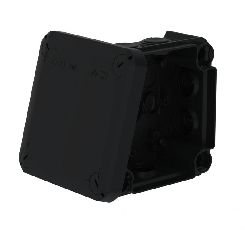 Junction box for the connection of cables and lines indoors and in protected outdoor areas. Square design with plug-in seals to the sides and knock-out entries in the bottom. Suitable for wall and ceiling mounting and on mounting panels. With the option to fasten inside and to mount via the corner domes. Cover with quick lock, sealable. Made from halogen-free and UV-resistant materials.