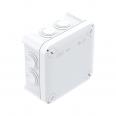 Junction box for the connection of cables and lines indoors and in protected outdoor areas. Square design with plug-in seals to the sides and knock-out entries in the bottom. Suitable for wall and ceiling mounting and on mounting panels. With the option to fasten inside and to mount via the corner domes. Cover with quick lock, sealable. Made from halogen-free and UV-resistant materials.