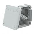 Junction box with terminal strip for the connection of cables and lines indoors and in protected outdoor areas. Square design with plug-in seals to the sides and knock-out entries in the bottom. Suitable for wall and ceiling mounting and on mounting panels. With the option to fasten inside and to mount via the corner domes. Cover with quick lock, sealable. Made from halogen-free and UV-resistant materials.