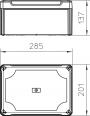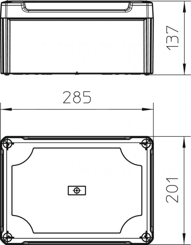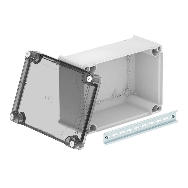 Closed junction box for the connection of cables and lines indoors and in protected outdoor areas. Rectangular design without entries. Suitable for wall and ceiling mounting, on mounting panels and threads in the floor. With the option to fasten inside and to mount via the corner domes. High, transparent cover with quick lock, sealable. Made from halogen-free and UV-stabilized materials.
