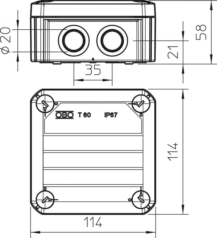Junction box with terminal strip for the connection of cables and lines indoors and in protected outdoor areas. Square design with knock-out entries to the sides and knock-out entries in the bottom. Suitable for wall and ceiling mounting and on mounting panels. With the option to fasten inside and to mount via the corner domes. With fixed clamping cover. Made from halogen-free and UV-resistant materials. Junction box according to DIN EN 60670. Flame-resistant to DIN EN 60695/2/11, test temperature 650 °C. Impact resistance IK07 according to DIN EN 50102.