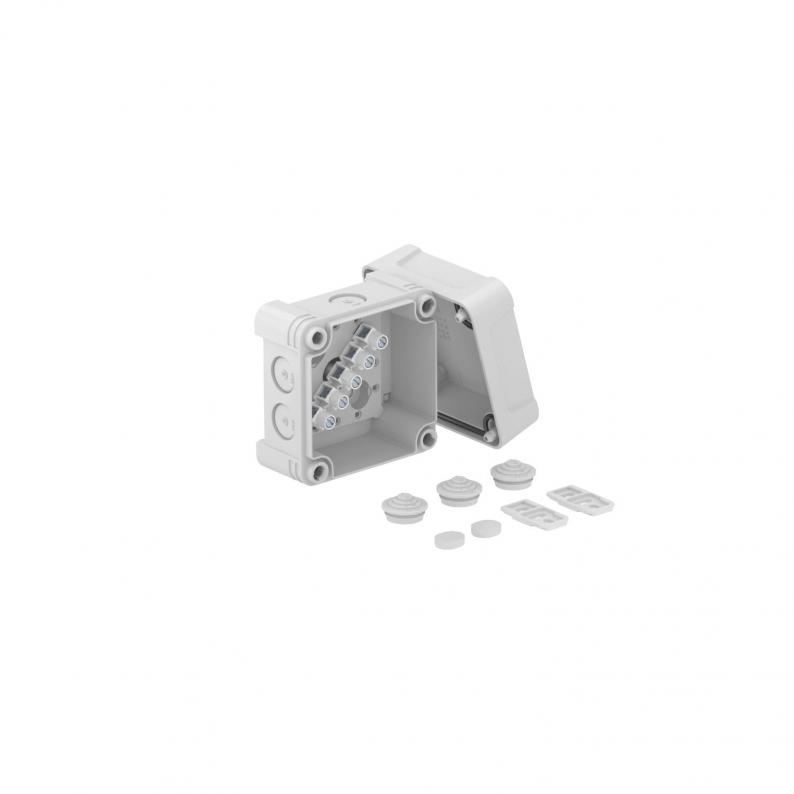 Junction box with terminal strip for the connection of cables and lines indoors and in outdoor areas. Square design with knock-out entries. Suitable for wall and ceiling mounting with the option to fasten outside, inside or to mount via the corner domes. Particularly impact resistant with IK09. Cover with quick lock, sealable. Made from halogen-free and UV-resistant materials.