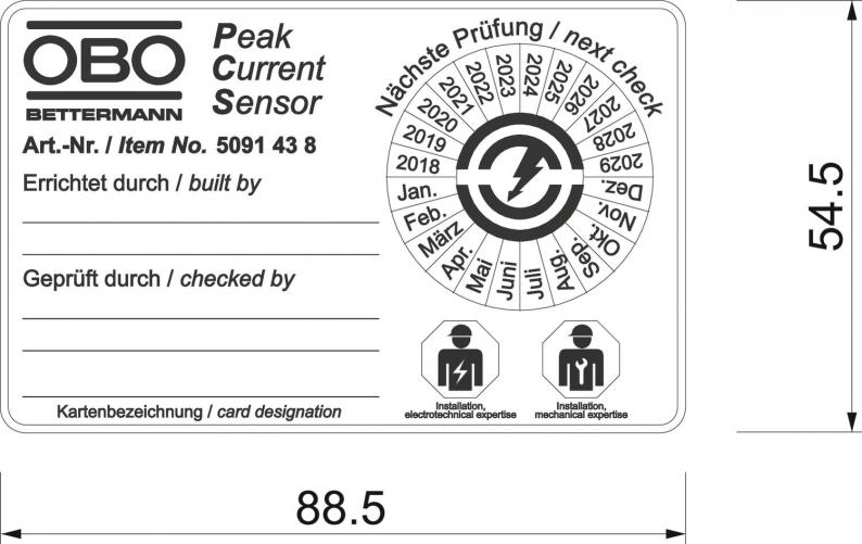 Peak Current Sensor (PCS) card for recording pulsed/lightning currents. A continuous check of whether lightning has struck the lightning protection system and how high the most recent lightning current was in kA can be carried out easily by the system operator, a specialist lightning protection company or by a surveyor. Here, the printed maintenance circuit and the labelling panels support the maintenance work of the entire lightning protection system, which must be performed at defined intervals according to VDE 0185-305-3 (IEC/EN 62305-3).