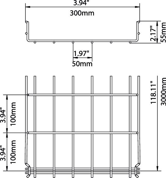 No additional connection components are required for the mesh cable tray, it is simply interlocked. The grid width is 50 x 100 mm (exception: GRM 55/50 = 20 x 100 mm).