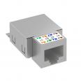 Connection module Cat. 5e shielded, with an RJ 45 slot. Includes an EMC screen hood, a dust cover, a cable tie and mounting instructions. Suitable for installation in data technology supports of type DTG-2RM and DTS-2RM.