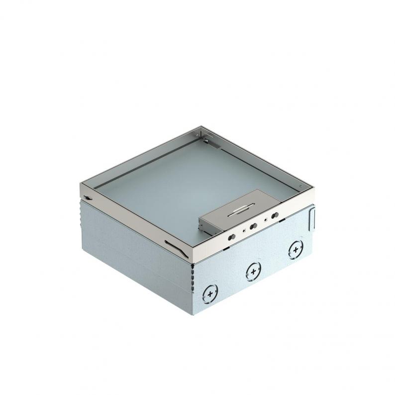 Square floor box for use in dry-cleaned cavity and screed floors in indoor areas. Installation housing with pre-marked insertion openings for pipes (M25). Empty housing for up to 2 UT3 universal supports for up to 6 Modul 45 ® devices. Cover adjustable to top edge of floor covering using four height-adjustment supports. The minimum installation depth is 95 mm, the height-adjustment range + 30 mm.