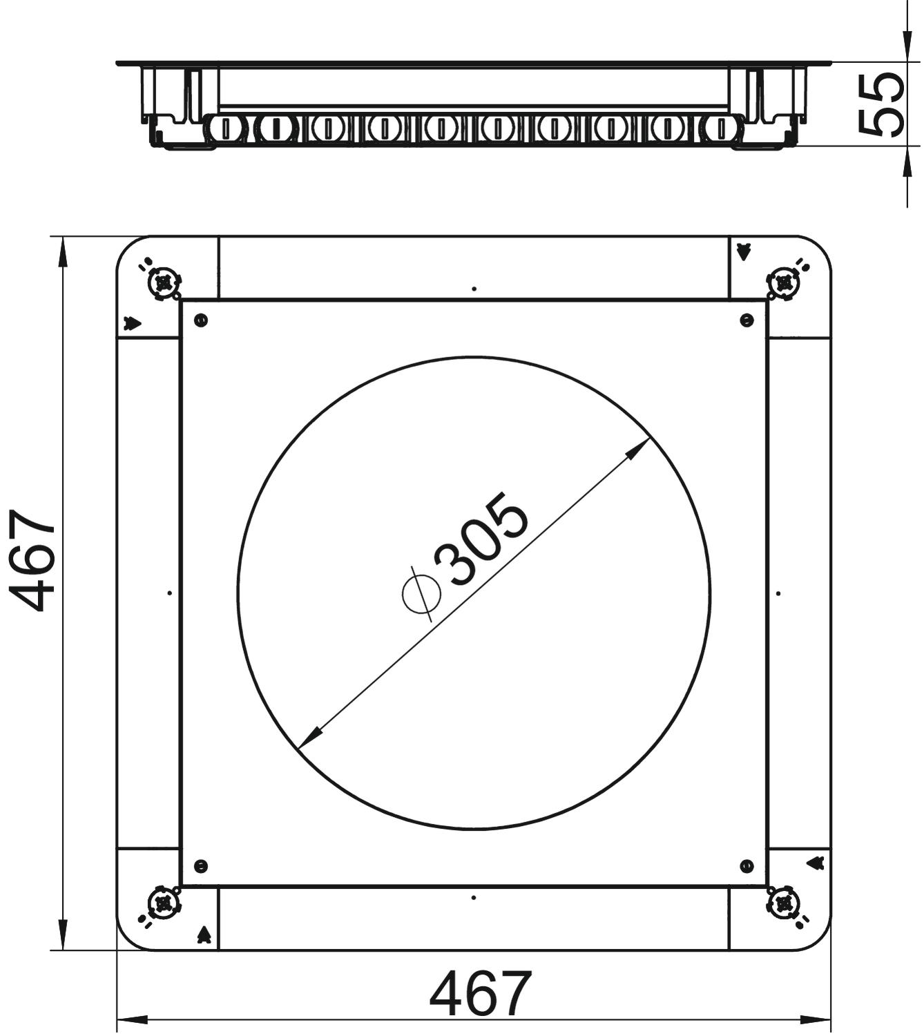 Underfloor accessory box with mounting lid and lid blanking plate with sheet steel side walls. For the installation of a square GES9 55 service outlet in screed heights of 55 mm or more. Height can be infinitely adjusted to the nominal screed height and the screed can be worked flush to the screed scraping edge. With 10 x M20, 3 x M25, 7 x M32 pipe insertion openings on each side. Usable pipe size at a system height of 55 mm: M20.