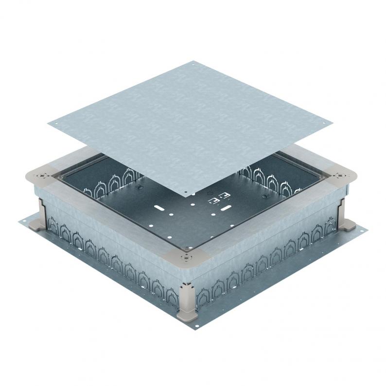 Underfloor junction and branch box for 10 installation pipes on each side (M20 or M32) with sheet steel side walls. To mount installation units in the mounting lid (to be ordered separately). Height can be infinitely adjusted to the nominal screed height (rapid adjustment possible) and the screed can be worked flushed to the screed scraping edge. With noise decoupling option after screed laying and can be used with system accessories, also for heavy-duty application.