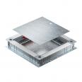 Junction and branch box for screed-covered underfloor installation duct with sheet steel side walls. For mounting of installation units in the mounting cover (to be ordered separately). Can be infinitely adjusted to a nominal screed height of 80–160 mm using the quick height-adjustment unit. The screed can be worked up to be flush with the screed draw-off edge. With noise decoupling option after screed laying and can also be used with system accessories for heavy-duty applications. Insertion of cables with the 2-part EÜK duct.