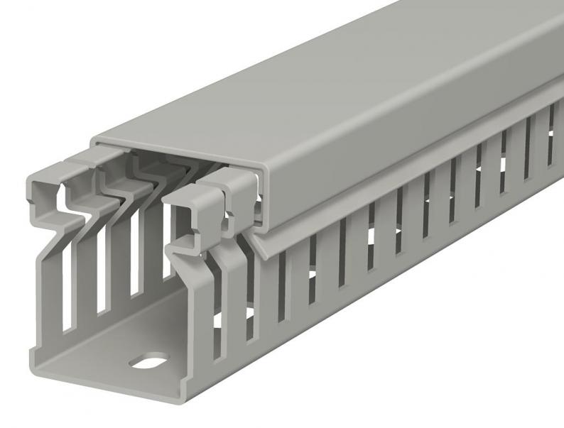 Wiring duct, incl. cover and base perforation, for horizontal and vertical routing of electrical cables in the switchgear cabinet. Designed as a metric duct. The nominal dimension of the system size corresponds to the internal dimension of the duct. Retainers are broken out without tools. The flush-floor routing of cables is possible through predetermined break points. Tested to DIN EN 50085-2-3. Special lengths on request.