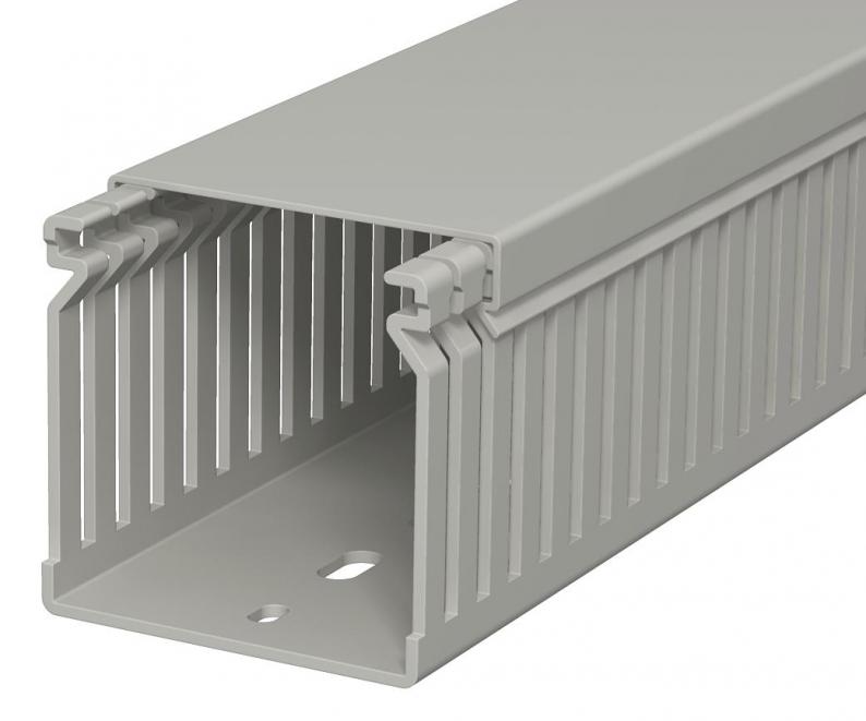 Wiring duct, incl. cover and base perforation, for horizontal and vertical routing of electrical cables in the switchgear cabinet. Designed as a metric duct. The nominal dimension of the system size corresponds to the internal dimension of the duct. Retainers are broken out without tools. The flush-floor routing of cables is possible through predetermined break points. Tested to DIN EN 50085-2-3. Special lengths on request.