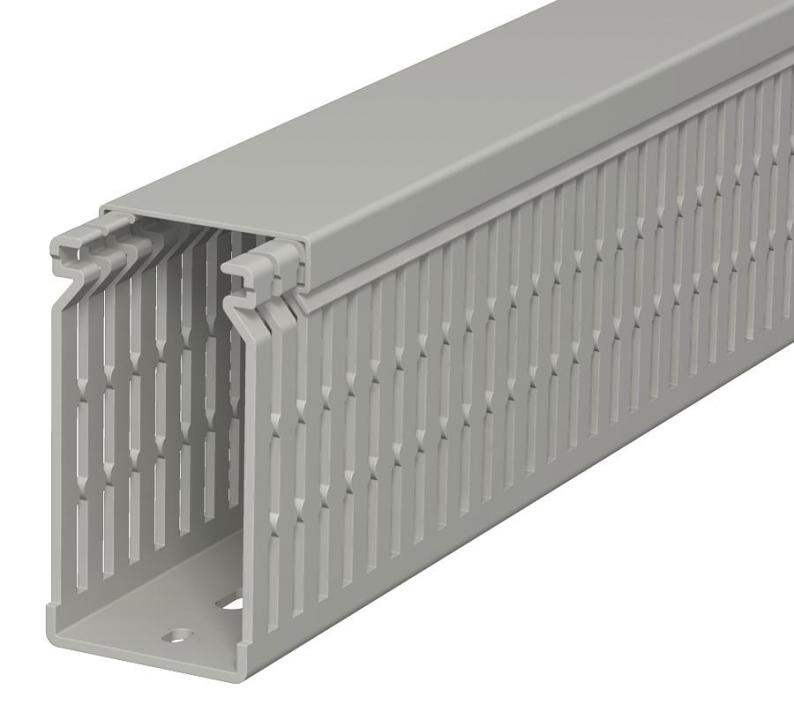 Wiring duct, incl. cover and base perforation, for horizontal and vertical routing of electrical cables in the switchgear cabinet. Designed as a metric duct. The nominal dimension of the system size corresponds to the internal dimension of the duct. Retainers are broken out without tools. The flush-floor routing of cables is possible through predetermined break points. Tapering in the side slots prevents the cables from falling out. Tested to DIN EN 50085-2-3. Special lengths on request.