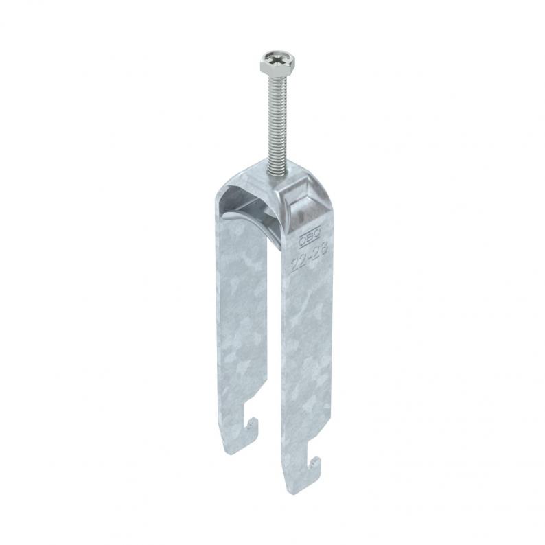 Clamp clip with U-foot, metal pressure sleeve with rounded edges to protect the cable. For vertical and horizontal mounting of 3 single cables on a C-profile rail. For slot width 18–22 mm. With 1-start screw thread on pressure sleeve, universal hexagonal screw head WAF10, with slot and cross recess. Suitable for assembly indoors and outdoors. Multiple cables should be separated by double sleeves. We recommend the use of a counter-sleeve.