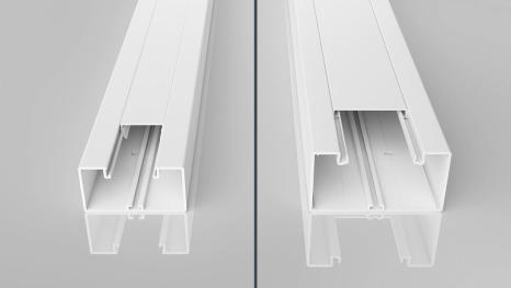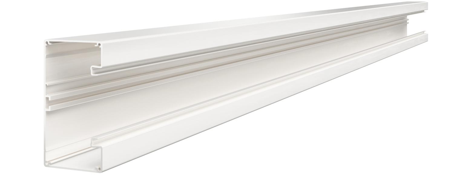 Device installation trunking Without base perforation suitable for direct wall mounting or mounting on panels. Over-lengths up to 6,000 mm for trunking bases and covers as well as other RAL colours can be provided on request. The visible surfaces of the device installation trunking are laminated.