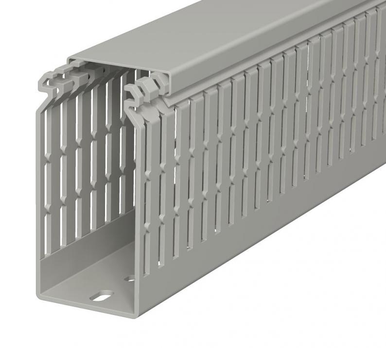 Wiring duct according to DIN EN 50085-2-3, incl. cover and base perforation, for horizontal and vertical routing of electrical cables in the switchgear cabinet. Designed as a DIN duct. Retainers are broken out without tools. The flush-floor routing of cables is possible through predetermined break points. Tapering in the side slots prevents the cables from falling out. Tested to DIN EN 50085-2-3. Special lengths on request.